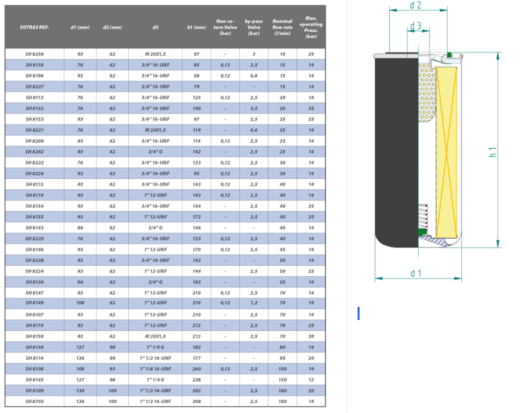 Các bộ lọc dầu mà Sotras cung cấp thường là loại spin-on và có thể được trang bị van bypass nếu van này chưa có sẵn trên đầu bơm hoặc trong mạch bôi trơn.